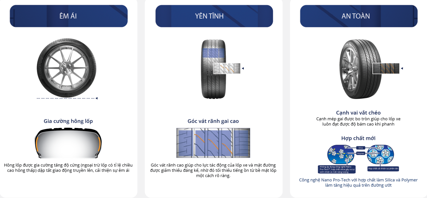 Turanza T005A là bước đột phá mới hướng tới sự hoàn hảo cả về thiết kế và chất lượng, giúp tạo nên những hành trình êm ái đầy thư thái, yên tĩnh và an toàn vượt trội dù ở cung đường ngắn hay dài. Nhờ những khối gai đa dạng được thiết kế đặc biệt, giúp tăng cường khả năng phân tán tiếng ồn cũng như các góc vát rãnh gai sâu, làm giảm va đập của lốp lên mặt đường, Turanza T005A có thể giảm lượng tiếng ồn phát sinh truyền vào trong khoang lái một cách hiệu quả. Ngoài ra, biên dạng bề mặt tiếp xúc của Turanza T005A với mặt đường cũng như vùng hông lốp cũng được cải tiến để giảm xung chấn, kết hợp cùng nền tảng công nghệ Nano Pro-techTM làm giảm sản sinh nhiệt và hạn chế năng lượng tiêu hao. Tất cả những cải tiến này giúp nâng cao trải nghiệm êm ái và thoải mái cho người dùng trên mọi cung đường.